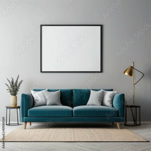 Fototapeta premium Modern interior background with empty frame mockup, minimalist room decor, contemporary wall display, stylish living space for branding and art presentation, clean and elegant home design concept
