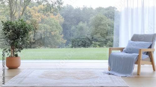 © JuanM, Fototapeta premium Modern interior design featuring a cozy chair and scenic nature view in the backdrop