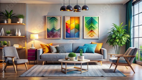 Fototapeta premium Modern Interior Design with Tilt-Shift Photography, Stylish Living Room Decor, Mockup Frame Wall Poster, Periodic Symbols, Home Aesthetics, Contemporary Style, Elegant Spaces, Interior Inspiration