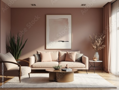 © Zorro2025, Fototapeta premium Modern interior in a Dusty Mauve palette, glass coffee table, soft sofa, statement artwork, warm diffused light