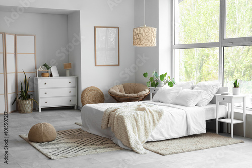 Fototapeta premium Modern interior of light bedroom with chest of drawers, bedside table and bed