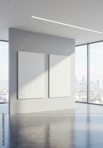 © KarenJ, Obraz premium Modern Interior Photo With Two Blank Frames in a Bright Room with City View