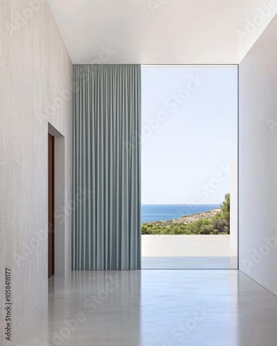 © JuanM, Obraz premium Modern interior view with sea horizon and soft curtains in a serene coastal setting