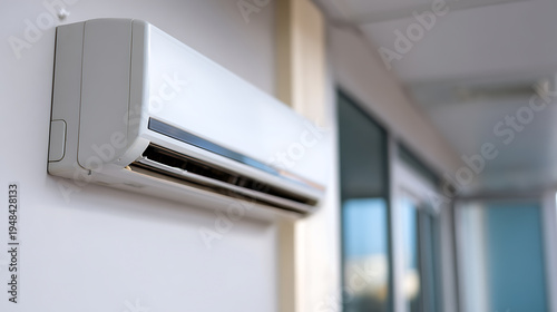 Obraz premium Modern Interior Wall-Mounted Air Conditioner Unit Provides Cooling Comfort in...