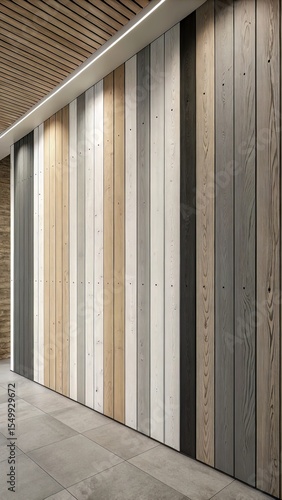 © MDPARVEZ, Fototapeta premium Modern interior with colorful wood paneling on wall and wood ceiling