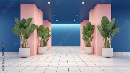 Obraz premium Modern Interior with Tropical Plants: Contemporary Architectural Space with Pink Columns and Blue Walls