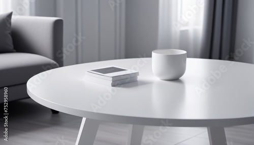 © Sergey, Obraz premium Modern interior with white table and white cup on it
