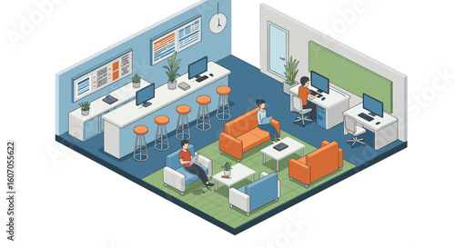 Obraz premium Modern isometric office lounge with collaborative workspace and techno