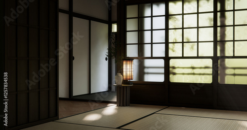 © Interior Design, Obraz premium Modern japan style empty room decorated with Lamp and tatami mat.