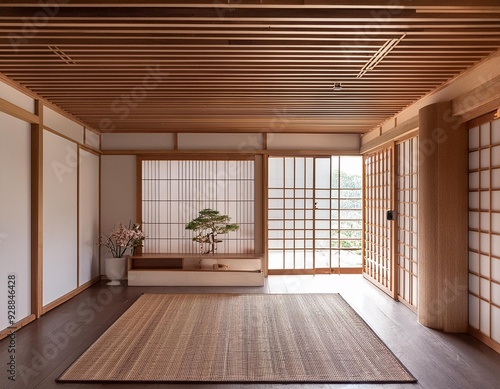 © Verdiana, Obraz premium Modern Japanese Home Interior Design with Wooden Beams and Sliding Doors