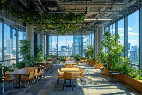 Naklejka premium Modern Japanese urban cafe with city views, plants, and tables
