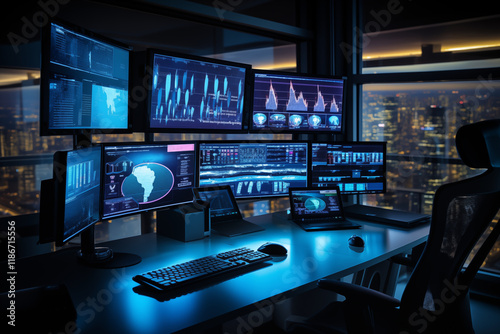 © Lucile, Fototapeta premium Modern JB Systems Technology in a High-Tech Workstation: Data Analytics in Progress