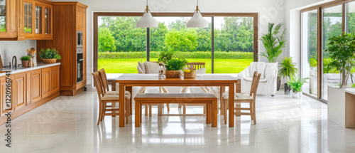 © JuanM, Obraz premium Modern kitchen and dining area with large windows and scenic view of greenery outside