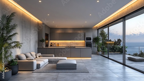 © siyons, Naklejka premium Modern kitchen and living room interior design with a view of the ocean.