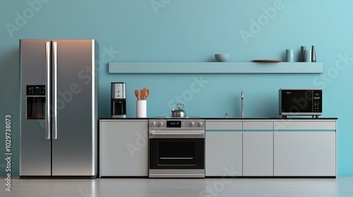 Fototapeta premium Modern kitchen appliance decor with sleek, stainless steel appliances, smart technology, and minimalist style