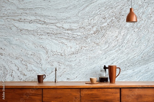 © Arwin, Obraz premium Modern kitchen counter with patterned wall and coffee setup.