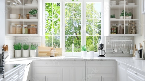 Fototapeta premium Modern Kitchen Design, Open Shelving, Wooden Pantry, Natural Light.