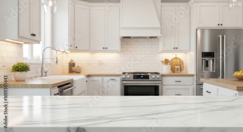 © Chainarong, Fototapeta premium Modern Kitchen Design Pristine White Marble Countertop with Blurred Background, Clean Look