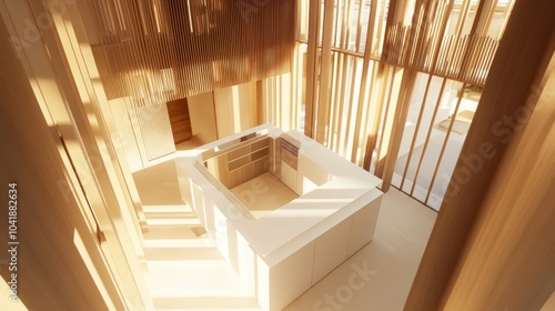 Obraz premium Modern kitchen design with wooden accents and natural light.