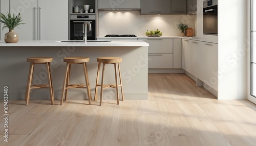 Fototapeta premium Modern kitchen durable, stylish vinyl plank flooring with white cabinetry, sleek countertops. Contemporary interior design features natural wood stools around central island. Clean lines, ample