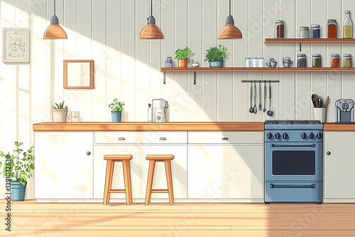 © Arachchi, Fototapeta premium Modern Kitchen Interior Design: Bright and Cozy Decor with Wood Accents and Blue Highlights