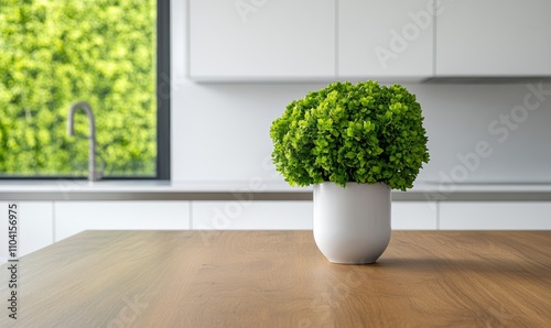 © fotogurme, Fototapeta premium Modern kitchen interior featuring clean wooden table; warm earth tones with white and stainless steel