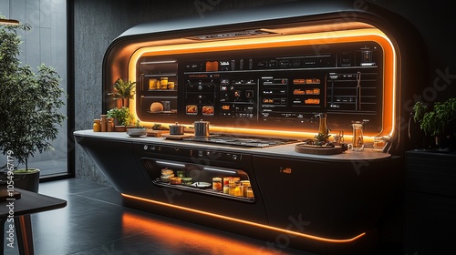 Obraz premium Modern kitchen interior featuring sleek design and ambient lighting with food...