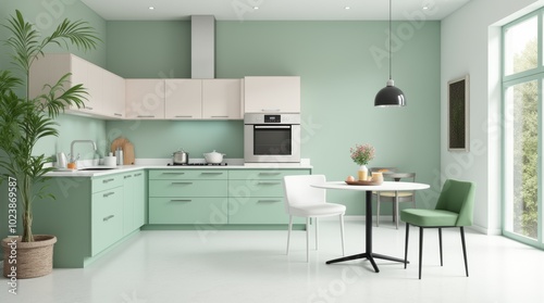Fototapeta premium Modern kitchen interior showcasing a green color palette with a wooden dining table and stylish chairs under a soft light