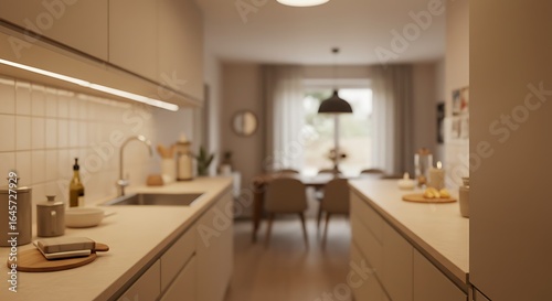 © Enimar, Fototapeta premium Modern Kitchen Interior with Cream Cabinets and Blurred Dining Room