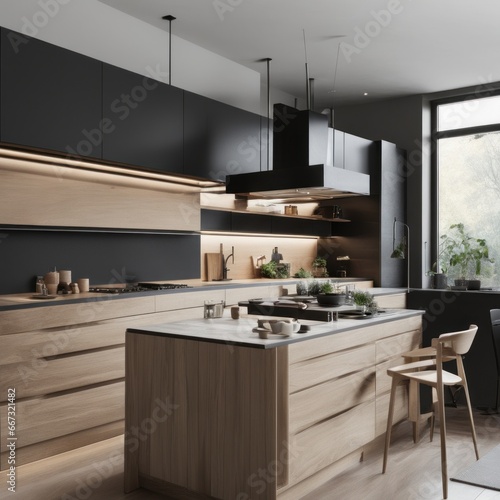 Fototapeta premium Modern Kitchen Interior with Kitchen Appliances and Dining Table