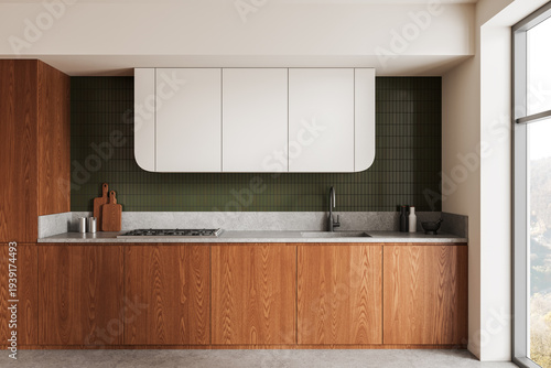 © ImageFlow, Fototapeta premium Modern kitchen interior with wood cabinetry, white upper units and green tiled backsplash in clean contemporary design."" 3D Rendering