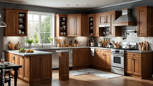 © Image or video art, Fototapeta premium Modern kitchen interior with wood cabinets and stainless steel appliances.