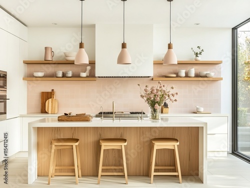 © Dede, Fototapeta premium Modern Kitchen Island with Light Pink Tiles and Wooden Accents