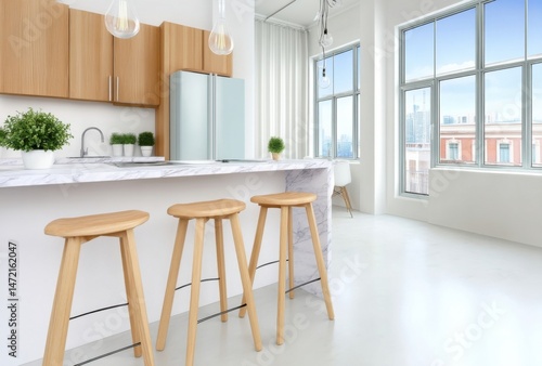 Fototapeta premium Modern kitchen island with light wood stools and marble countertop, overlooking a city view through large windows. : Generative AI