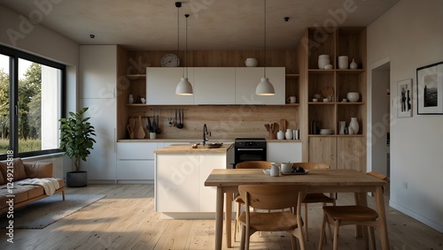 © Laiba, Fototapeta premium Modern kitchen with clean lines, light wood cabinets, and a white island illuminated by natural light