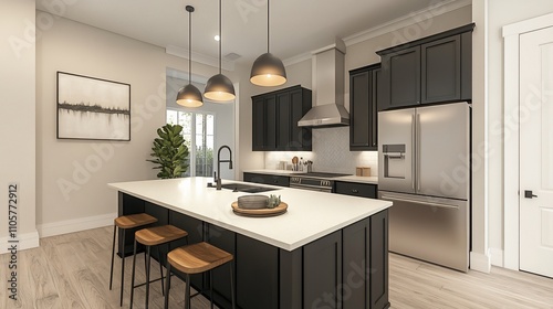 Fototapeta premium Modern kitchen with dark cabinetry, island, and stainless steel appliances.