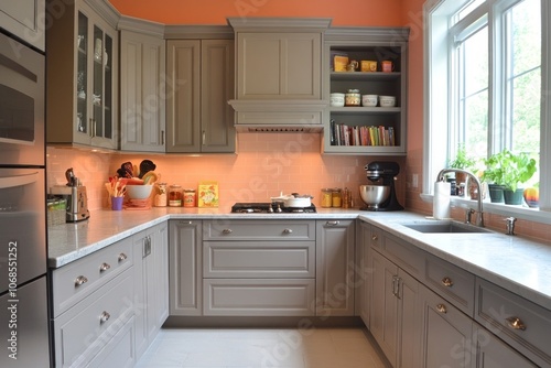 © Agus, Fototapeta premium Modern Kitchen with Grey Cabinets, Orange Walls, and White Countertops