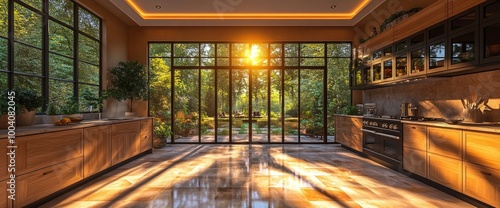 Fototapeta premium Modern Kitchen with Large Window View of Lush Garden and Sunlight Streaming In