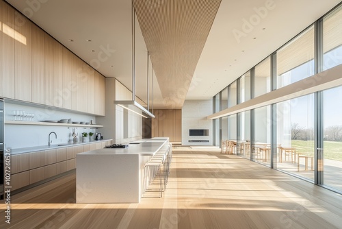 Fototapeta premium Modern kitchen with large windows and wooden floors