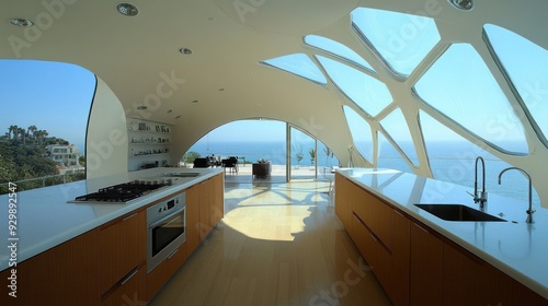 © Iswanto, Fototapeta premium Modern kitchen with large windows overlooking the ocean.