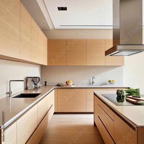 © Photo18@desing, Fototapeta premium Modern kitchen with warm wooden cabinetry and sleek metallic hardware