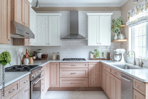 © Agus, Fototapeta premium Modern Kitchen with White Cabinets, Stainless Steel Appliances, and Light Wood Accents
