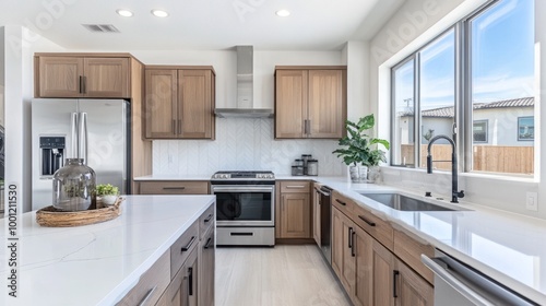 Fototapeta premium Modern kitchen with wooden cabinets, stainless steel appliances, and natural...