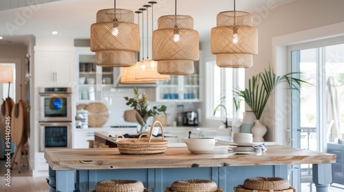Fototapeta premium Modern kitchen with woven pendant lights and natural decor.