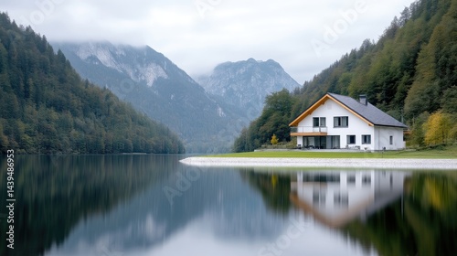 © surga, Naklejka premium Modern lakefront home nestled in mountains