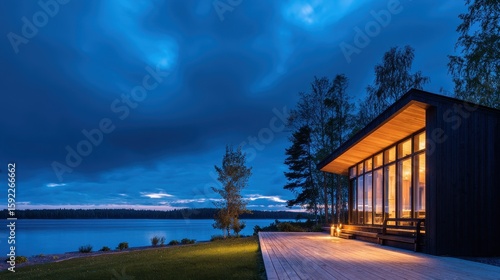 © mudrika, Obraz premium Modern lakeside cabin at dusk with serene water reflections and cloudy sky backdrop