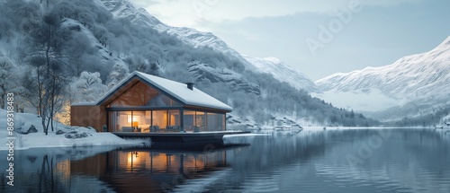 Fototapeta premium Modern lakeside cabin with large windows, surrounded by snowy mountains, warm interior lights glowing