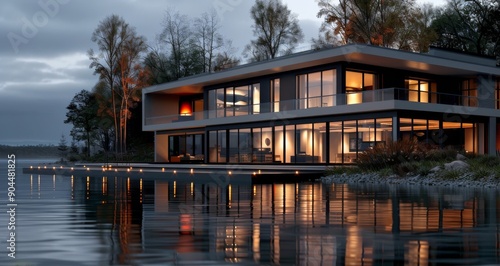 © ArtCookStudio, Fototapeta premium Modern Lakeside House at Dusk With Illuminated Windows and Reflected Light