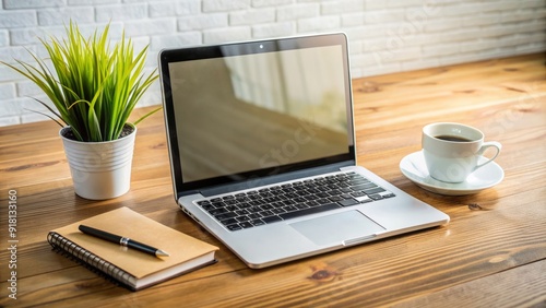 Fototapeta premium Modern laptop and notebook on a wooden desk with a blurred background, awaiting customer inquiries and support requests, representing a company's contact us page.