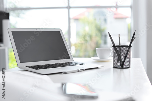 Fototapeta premium Modern laptop and supplies on table in office